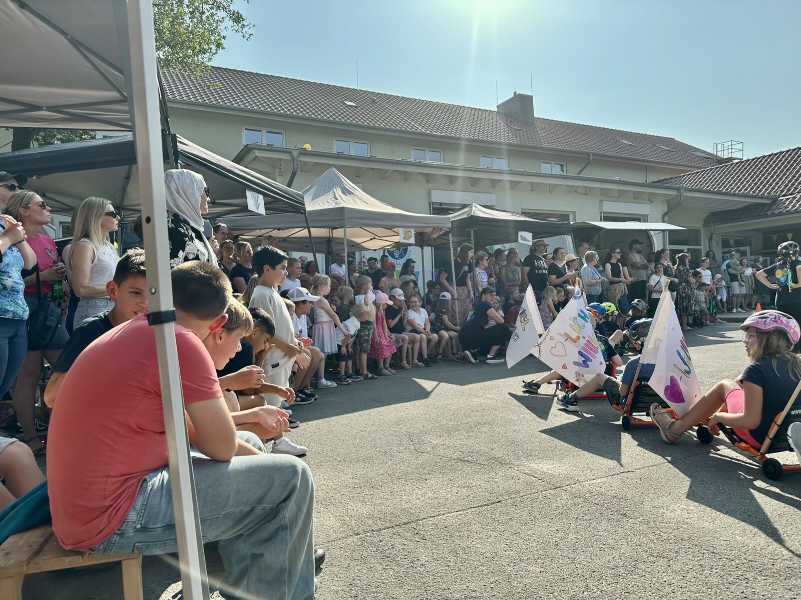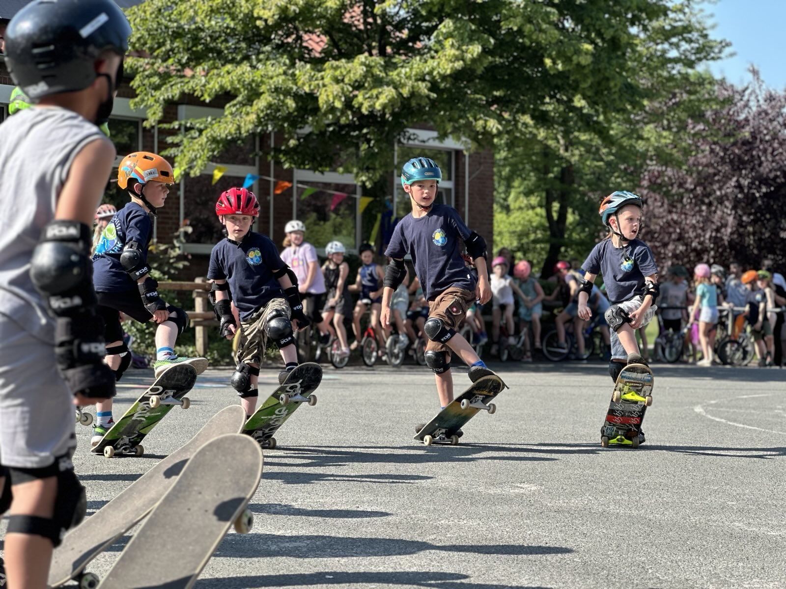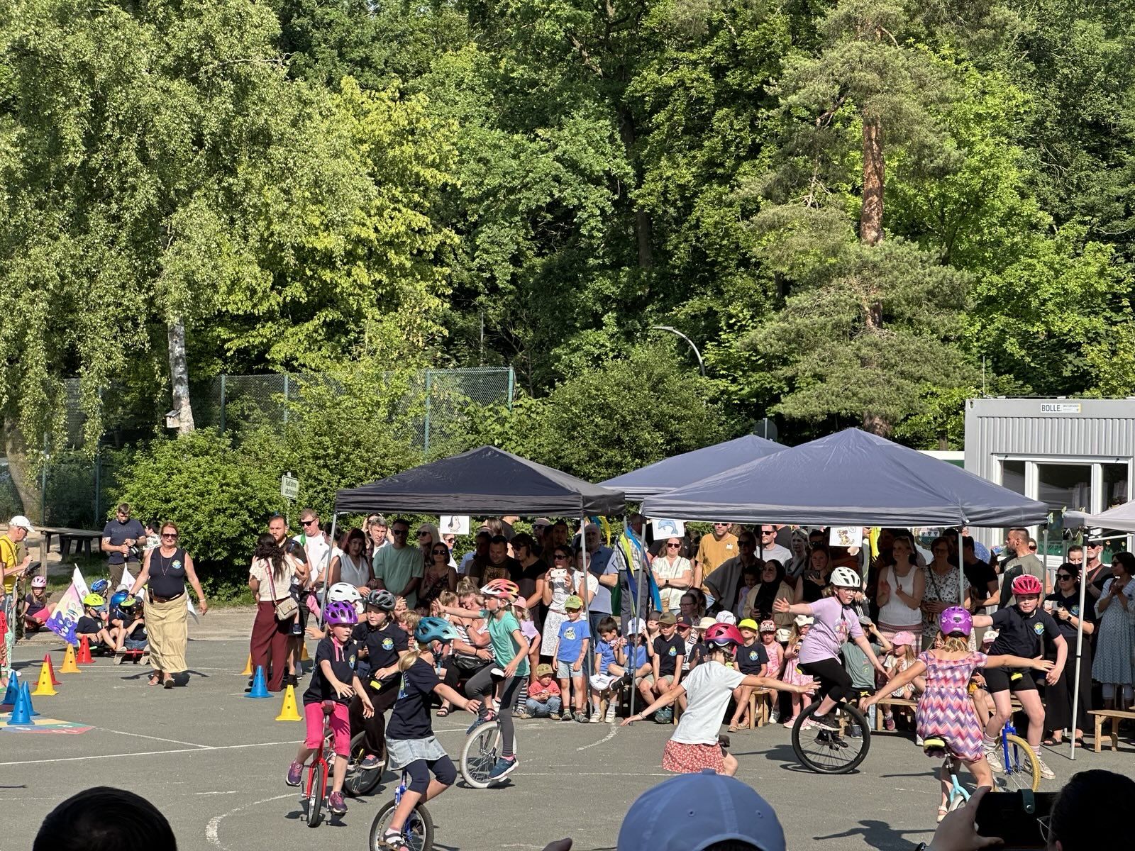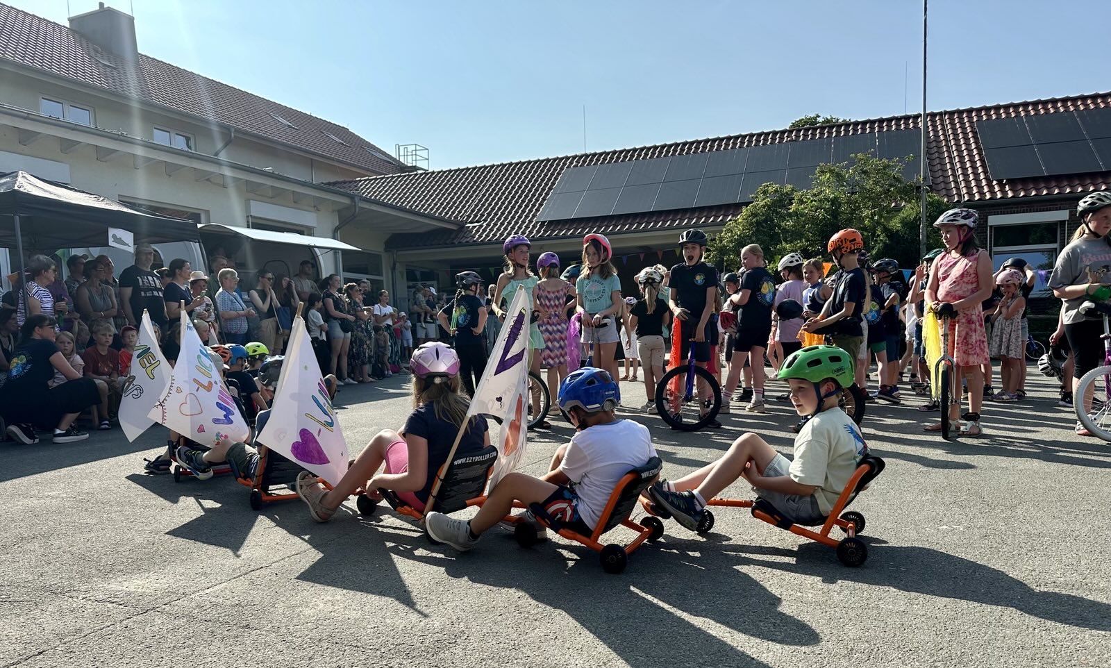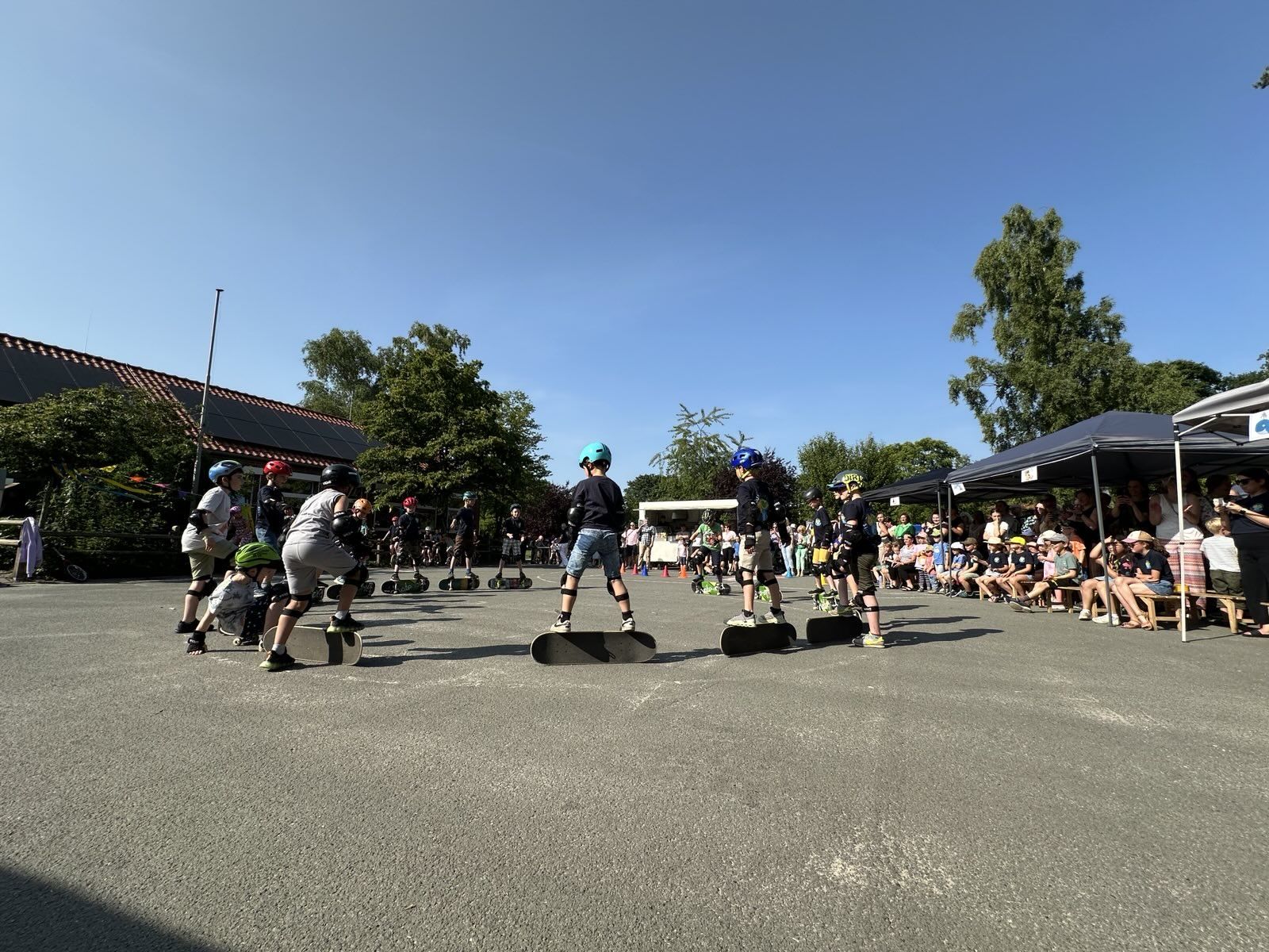 Eltern, Großeltern, ehemalige SchülerInnen und FreundInnen der Schule, verfolgten eine emotionale mit passender Musik untermalte Aufführung von ca. 150 Kindern aus allen Klassen, die mit Easyrollern, Skateboards und Einrädern das Publikum begeisterten. Auch einige Lieder wurden von den Klassen vorgetragen.