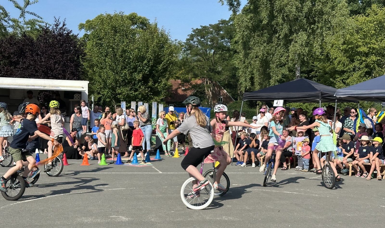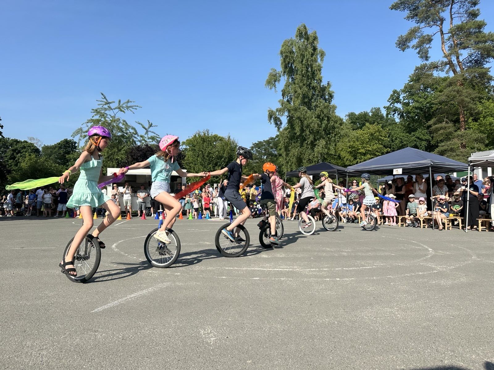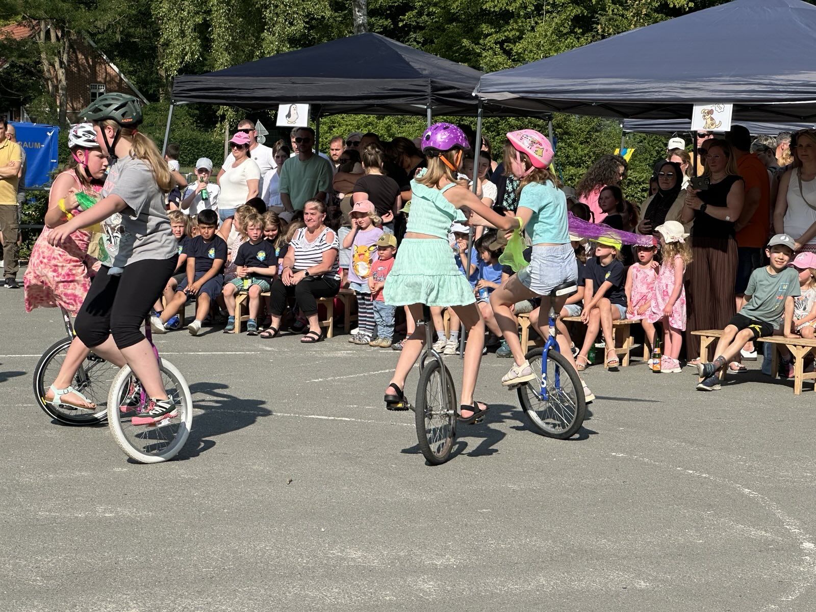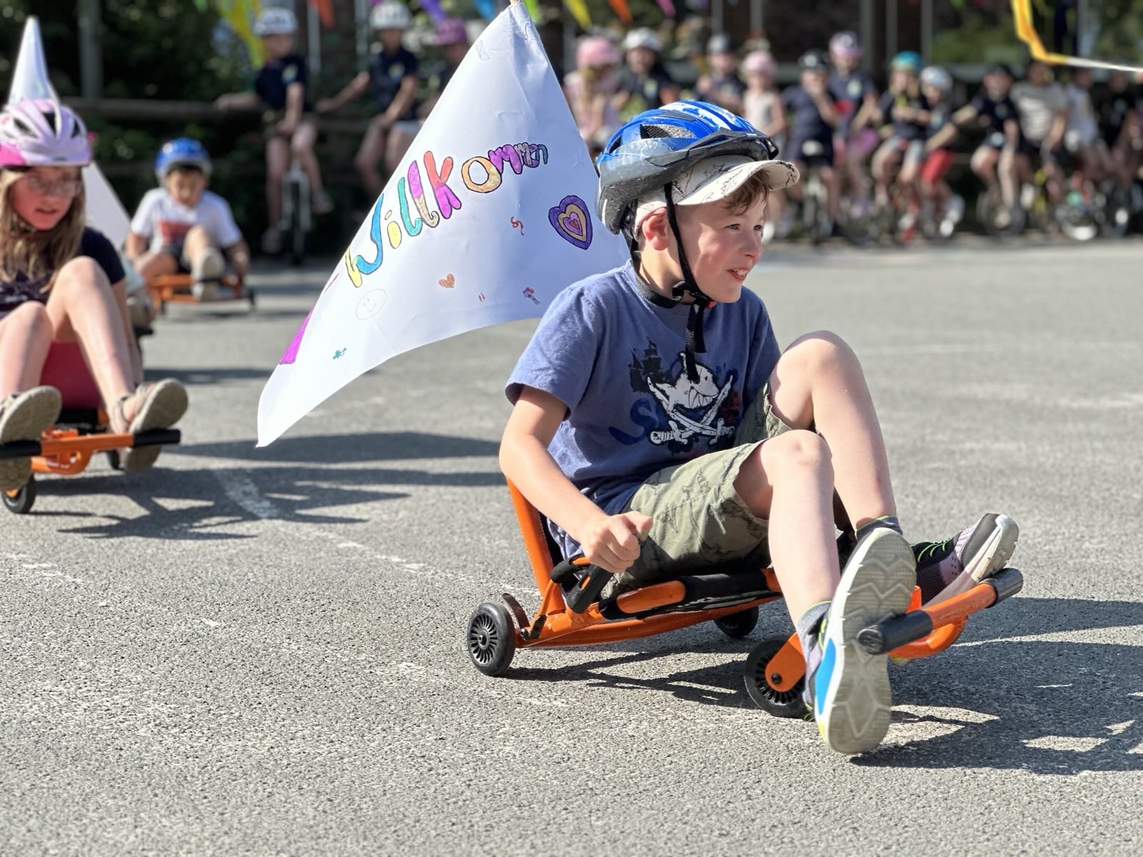 Eltern, Großeltern, ehemalige SchülerInnen und FreundInnen der Schule, verfolgten eine emotionale mit passender Musik untermalte Aufführung von ca. 150 Kindern aus allen Klassen, die mit Easyrollern, Skateboards und Einrädern das Publikum begeisterten. Auch einige Lieder wurden von den Klassen vorgetragen.