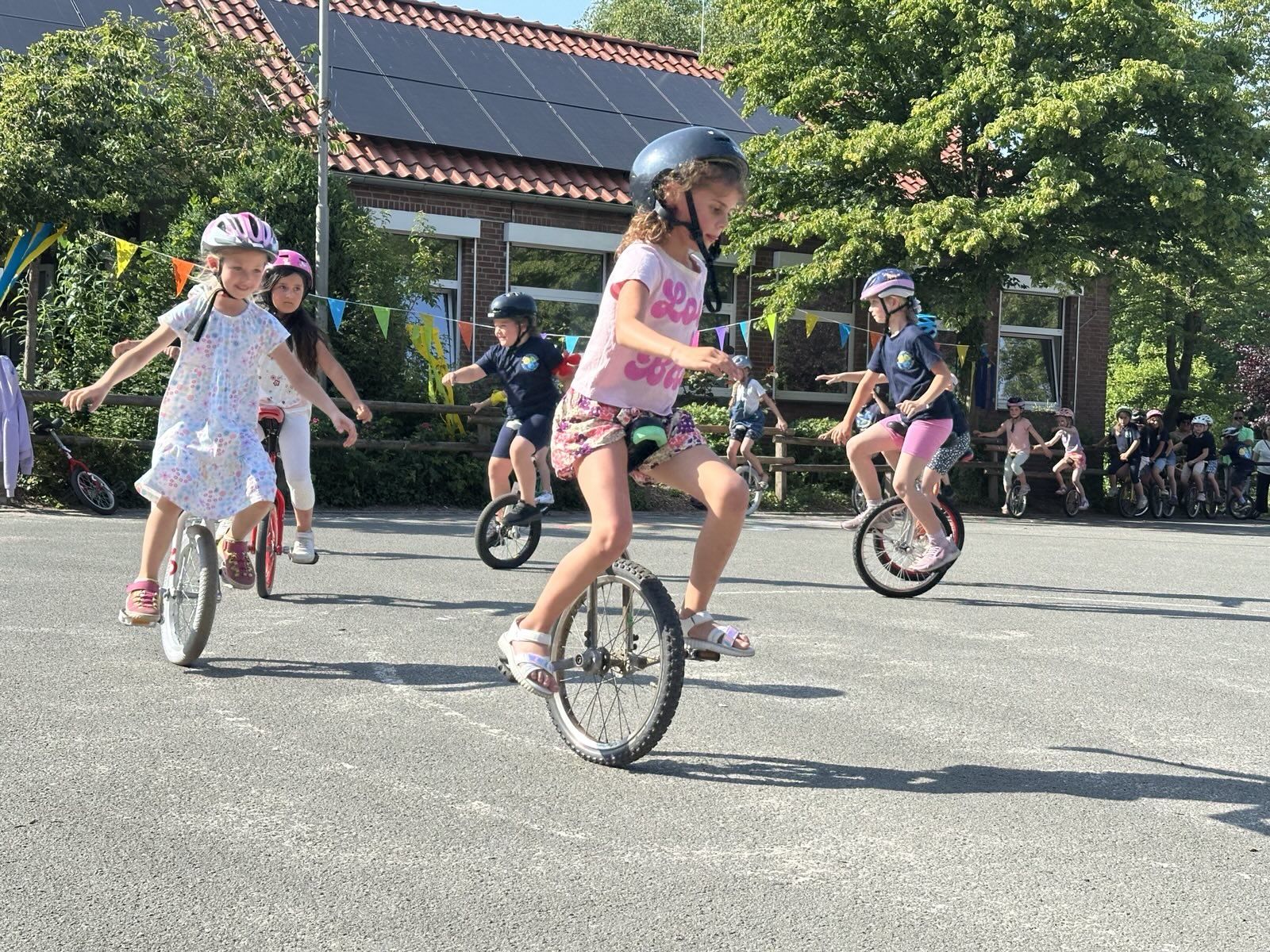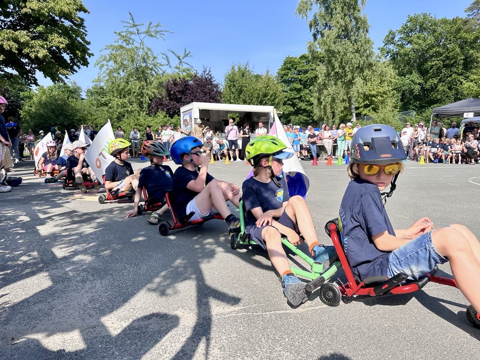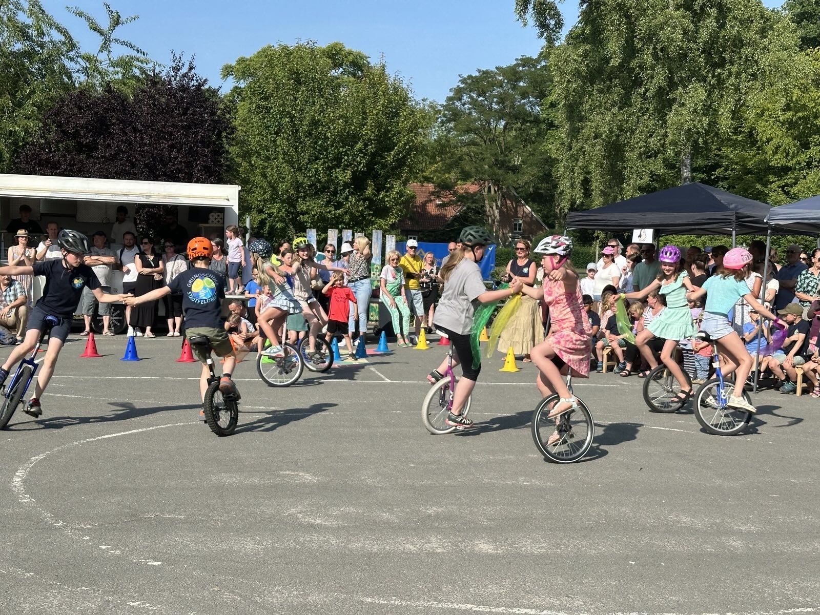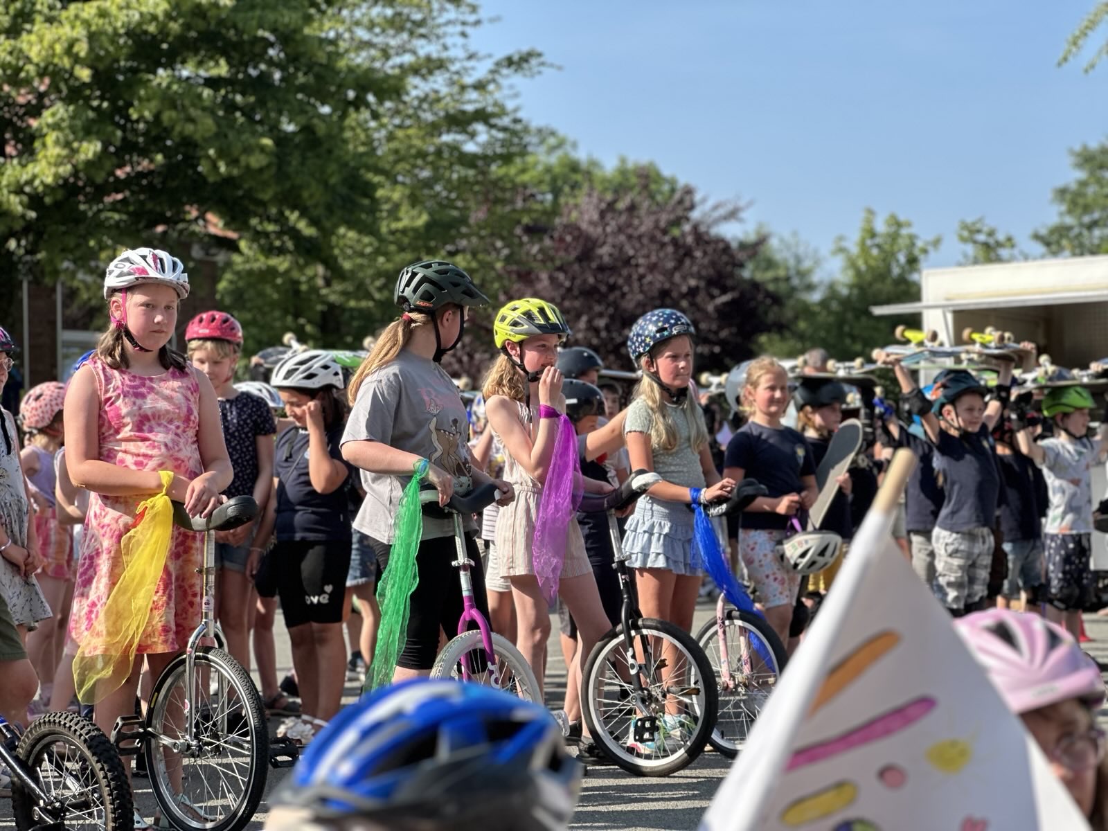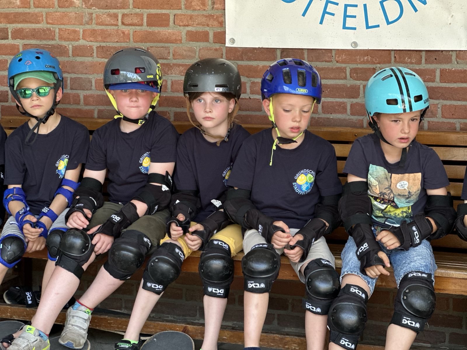 Eltern, Großeltern, ehemalige SchülerInnen und FreundInnen der Schule, verfolgten eine emotionale mit passender Musik untermalte Aufführung von ca. 150 Kindern aus allen Klassen, die mit Easyrollern, Skateboards und Einrädern das Publikum begeisterten. Auch einige Lieder wurden von den Klassen vorgetragen.